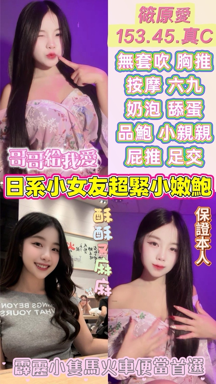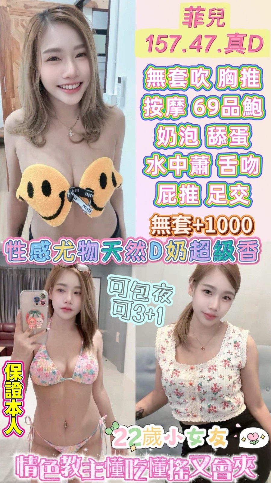 無套吹/共浴殘廢澡/親密KISS(視個人衛生和妹妹現場感覺.自行開發)/按摩/胸推/69/品鮑/舔蛋/屁推/深喉嚨/胸磨臉/足交/水中蕭/豪邁吃屌